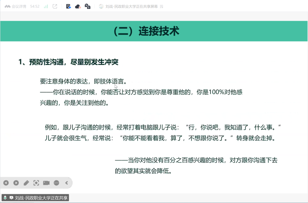 基于此,刘老师重点向大家传授了接诉即办的核心沟通技巧与专业方法。以“允许差异、尊重独特性”为沟通理念,运用共情技术精准捕捉情绪、连接技术传递关注、冲突暂停技术化解僵局;依托精神分析、萨提亚家庭治疗等专业理论,结合个案、小组、社区工作方法,从个体需求满足、群体矛盾调和、社区长效治理多个维度破解难题;通过观察、感受、需求、请求这四个非暴力沟通的要素,搭建高效沟通桥梁,实现矛盾从表面化解到根源解决的转变。