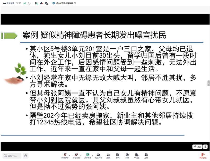 典型案例的分享让社会工作理论落地生根。案例中73岁老人投诉计划生育政策,实则是面临养老孤独与家庭系统变化的深层困境;67岁独居大爷反复投诉物业,核心诉求是渴望被认可为社区一员、减轻生活负担。通过倾听共情、资源链接、多方协同等专业手段,这些看似棘手的投诉均得到妥善回应,印证了“以人为本”专业方法的实践价值。