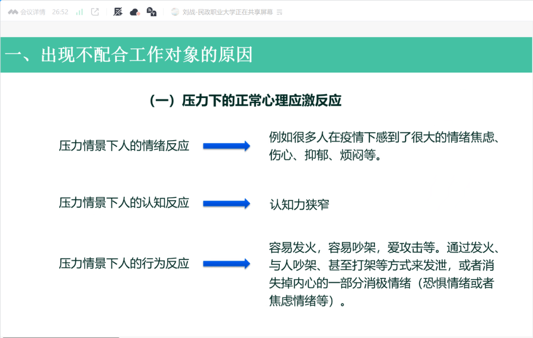 培训中,刘老师深入解析了投诉者的心理特征与行为逻辑。投诉者多处于压力应激状态,伴随负面情绪爆发、认知狭窄、行为对抗等反应,且其表现与心理发展水平、大脑双系统(应对系统与放松系统)的切换密切相关。