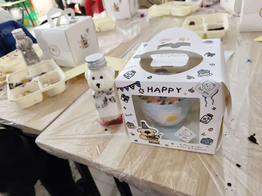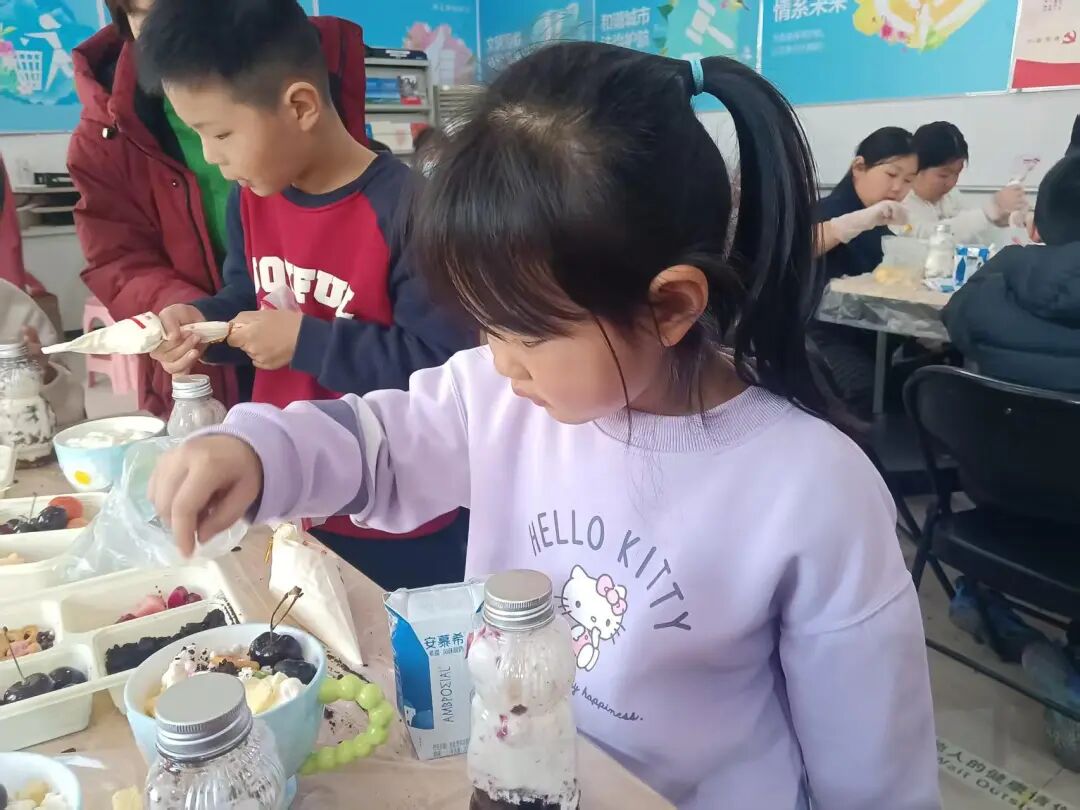 反诈知识学习结束后,创意实践环节精彩登场,成为孩子们释放天性的快乐舞台。先是开始暴力熊酸奶杯制作,社工早已提前备好剪好开口的安慕希酸奶,搭配奥利奥碎、水果丁、彩色谷物等丰富配料,孩子们只需层层叠加、兹有搭配,便能亲手打造Q萌可爱、酸甜可口的专属甜品,简单易操作的流程设计,让孩子们快速上手,充分感受手工创作的乐趣。